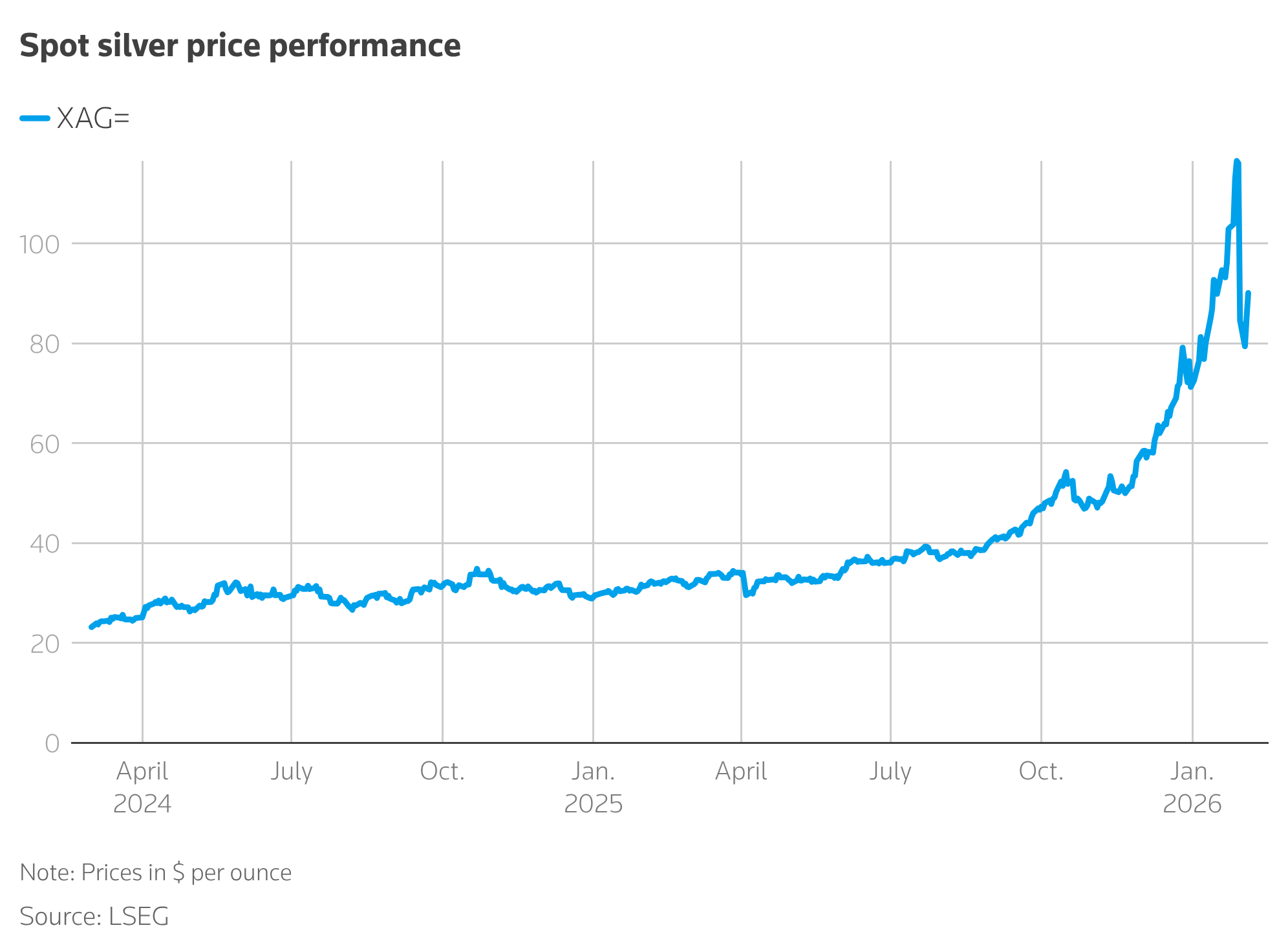 兼具避险属性与工业金属属性的白银在2025年大涨147%,并在1月29日延续涨势、触及121.64美元/盎司的历史新高,随后回落至89.70美元/盎司