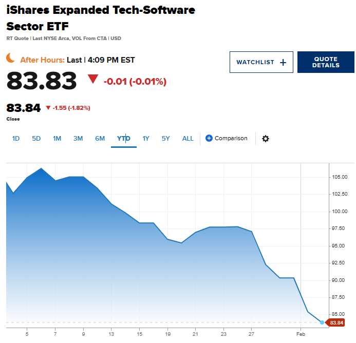 作为板块重要跟踪工具之一,iShares Expanded Tech-Software ETF(IGV)本周下跌约8%,使其今年以来跌幅扩大至逾21%;从去年9月创下历史高位以来,该ETF累计跌幅约30%。