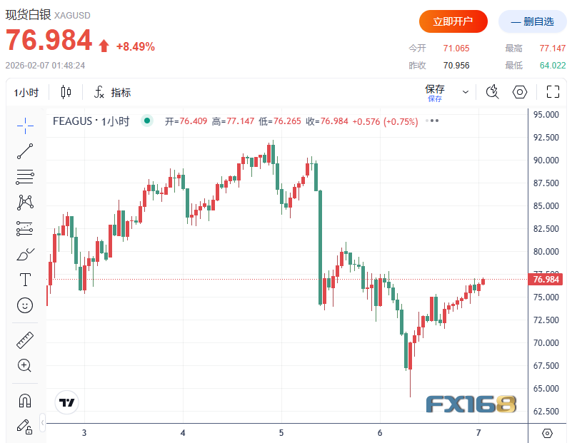 金属市场价格也在此前剧烈波动后稍稍“冷静”。黄金上涨2%,至4986.20美元/盎司;白银大涨超8%,涨破77美元。