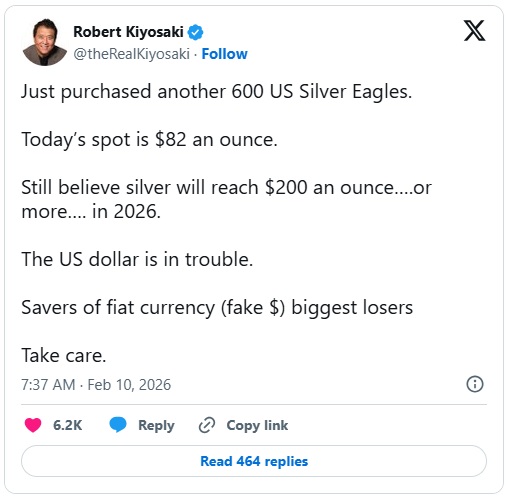 24K99讯 知名财经网站Finbold周二(2月10日)撰文称,随着白银价格回升至82美元/盎司,知名投资者、畅销个人理财书《富爸爸穷爸爸》作者罗伯特·清崎(Robert Kiyosaki)在社交媒体平台X发文称,他刚刚向白银投入了约5万美元,并将2026年白银目标价上调至200美元/盎司。