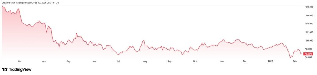 这位投资者还认为,美元“正陷入麻烦”。事实上,美元指数(DXY)——用于衡量美元兑一篮子主要货币汇率表现的指数——近几个月持续走弱,并在过去一年累计下跌超过10%。