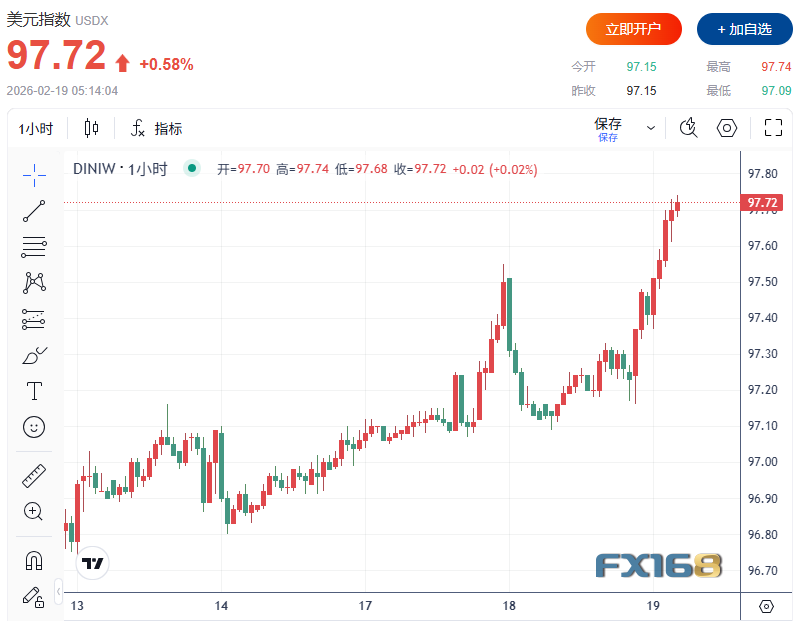 美元指数持续攀升并刷新日高至97.74,较日低拉升65点。