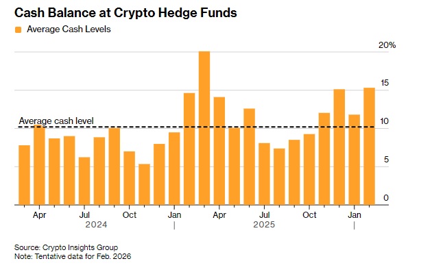 这一下滑似乎促使越来越多的加密对冲基金转向现金,这凸显了10月暴跌后2万亿美元的损失对专业投资者造成的冲击之深,以及2026年市场信心依然难以捉摸。