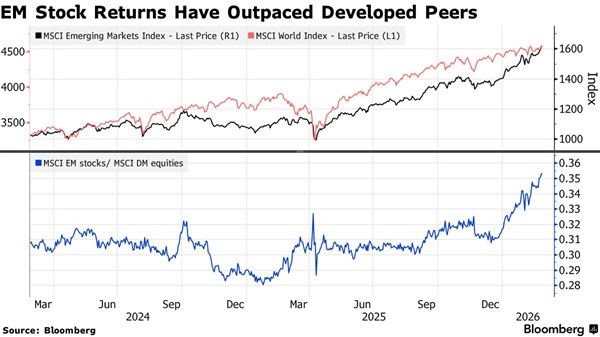 尽管本周全球市场因担忧人工智能可能扰乱经济的多个领域而出现波动,新兴市场资产仍持续表现良好。
