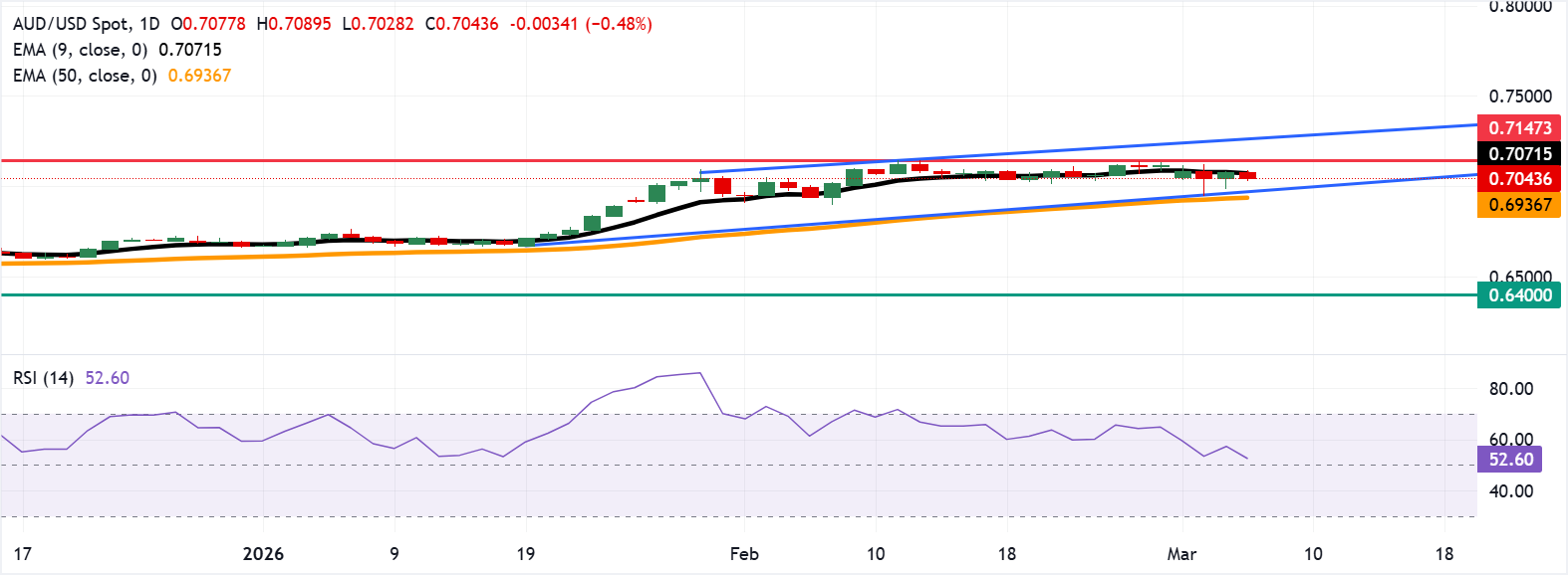 澳元/美元可能在0.7071的九日EMA处找到直接阻力,随后是2月12日达到的三年高点0.7147。进一步上涨将支持该货币对接近上升通道的上边界,约为0.7270。