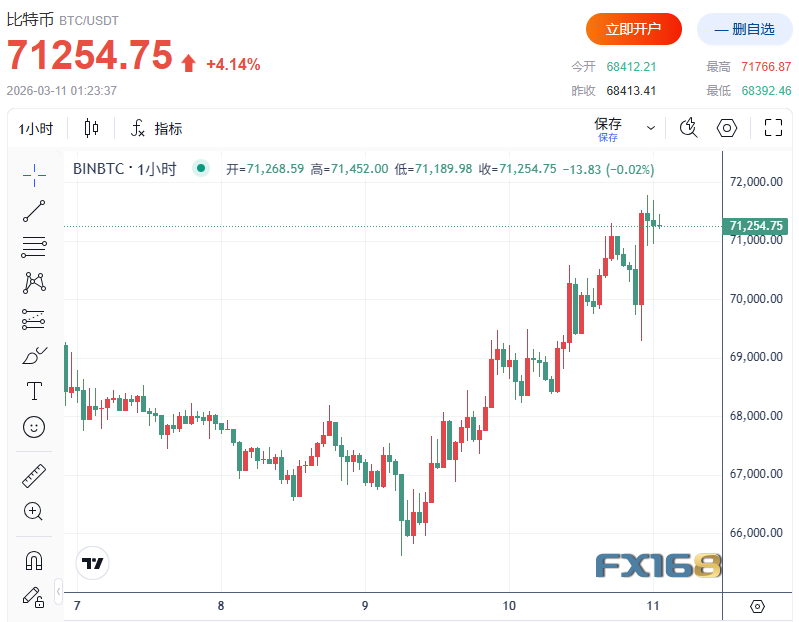比特币交投于71000美元上方,过去24小时上涨超4%,但整体仍处于区间震荡。