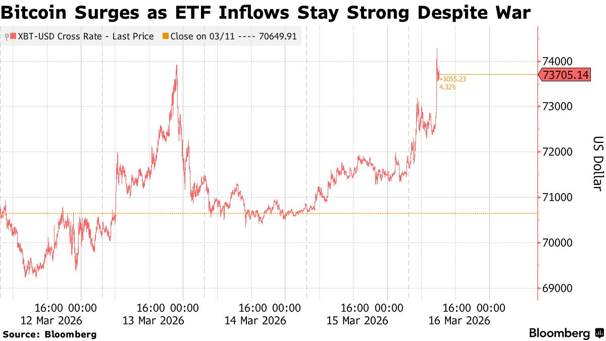 FX168财经报社(亚太)讯 由于交易员仍在消化中东局势带来的不确定性,比特币在周一(3月26日)再度走强,升破关键的7.4万大关。过去两周内,这一位置曾四次压制其上行,但此次突破后,比特币很快又回落至该水平下方。