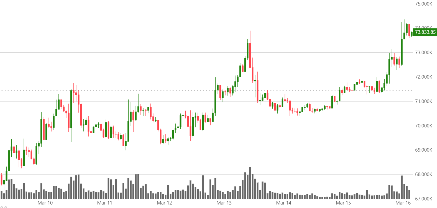 短期来看,比特币面临74,000美元这一阻力位。3月4日和3月13日,它都曾两次冲击这一关口但未能突破。不过,市场看涨情绪已经被点燃,随着金价持续走软,比特币很可能继续吸引资金流入,并有望推动价格向上突破。