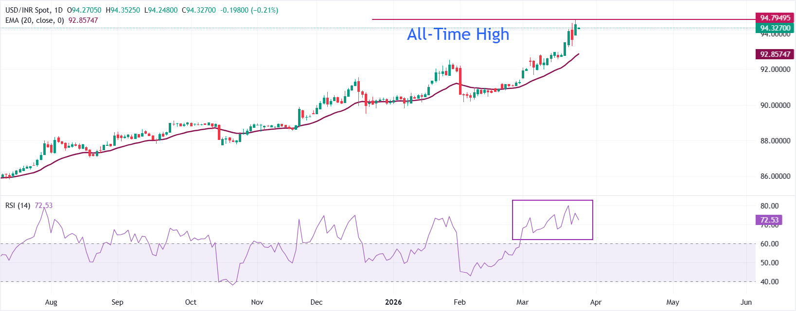 印度卢比(INR)周三开盘兑美元(USD)小幅走高,美元/印度卢比汇价从前一日创下的历史高点94.75回落至94.30附近。随着油价承压,印度货币暂时获得支撑,此前有报道称美国正寻求与伊朗达成为期一个月的停火协议,并提出了15点协议方案,显示出这场持续25天的战争出现了实质性缓和迹象。