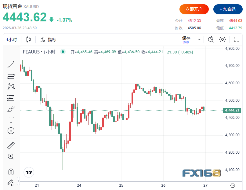 FX168财经报社(北美)讯 周四(3月26日),黄金价格震荡回落,结束此前两连涨走势。截止发稿,现货黄金(XAU/USD)报4444美元附近,日内下跌1.37%,较周三触及的4602美元高位明显回落。