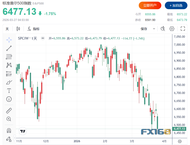 FX168财经报社(北美)讯 周四(3月26日),美股三大股指集体收跌,国际油价大幅上涨令市场承压,投资者持续消化中东局势最新进展。标普500指数回落,纳斯达克综合指数大跌逾2%,并正式进入技术性回调区间;道琼斯工业平均指数同样走低。随着原油价格飙升、美国国债收益率上行,市场风险偏好明显降温。