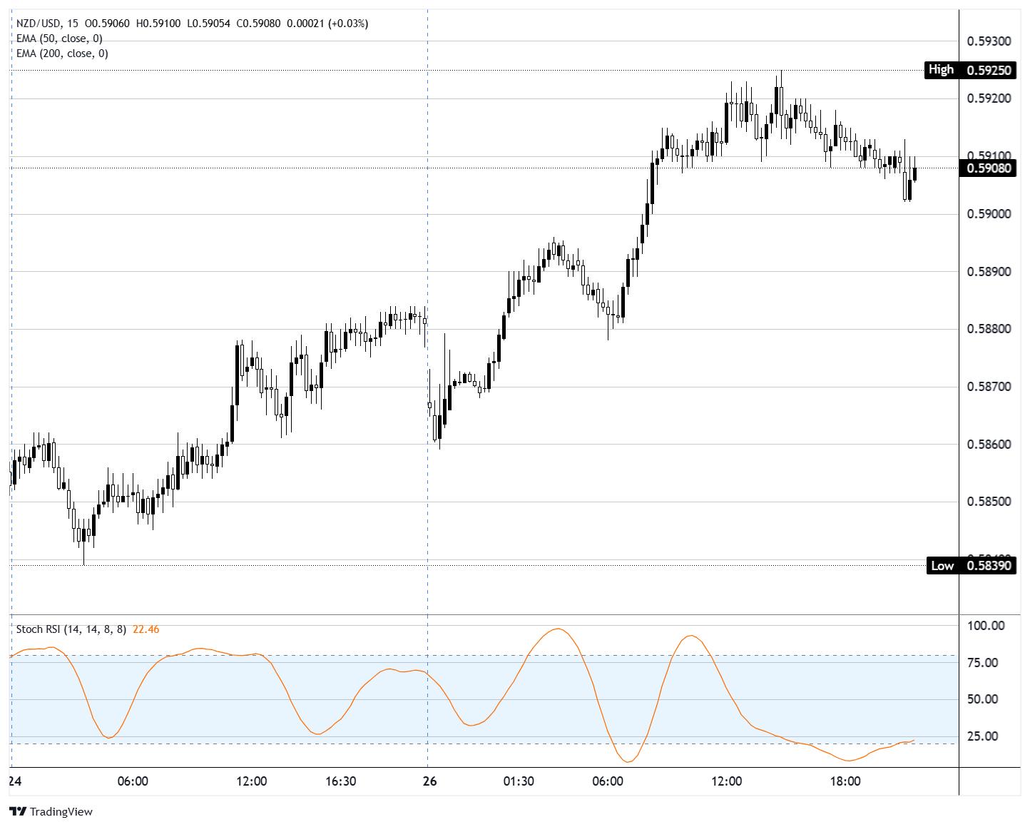 纽元/美元周一小幅上涨约0.4%,收于接近0.5905,但在上周反弹受阻的0.5925区域下方停滞。该货币对被困在短期区间的上限,动能在0.5900关口附近减弱,买家难以延续反弹。自4月初低点0.5680以来,日线图继续显示更高的低点,但本月早些时候的区间高点显示出疲态。