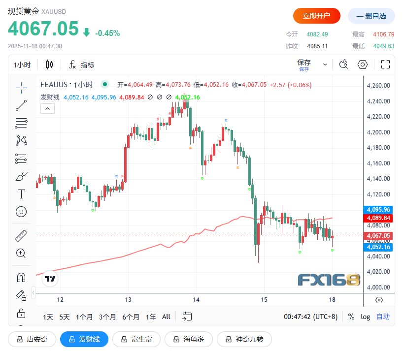 FX168财经报社(北美)讯 在投资者对美联储降息预期进一步降温的背景下,黄金周一(11月17日)仍受困于每盎司4,100美元下方,并继续面临下行压力。随着政府停摆延迟的大批经济数据陆续回归,市场对美国经济前景的判断仍被“数据迷雾”所笼罩,美联储政策路径也愈发不明朗。此前金价未能稳守4,200美元/盎司关口,引发部分投资者获利了结,使得贵金属短线难以企稳。