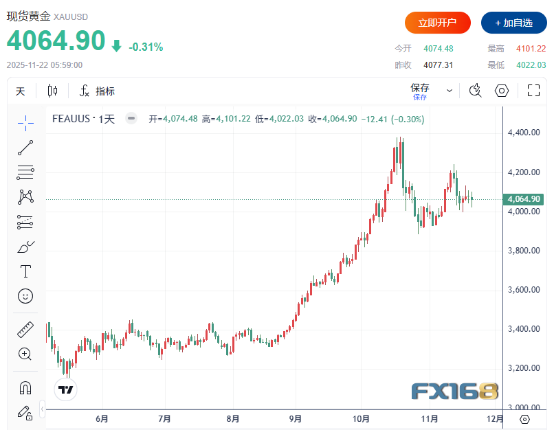 周五美市尾盘,现货黄金收报4,064.90美元/盎司,日内下跌12.41美元或0.31%,本周则下跌20.21美元或0.49%。