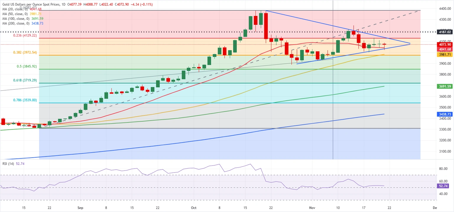 上行方面,阻力见于4,130美元(23.6%斐波那契回撤位与下降趋势线),随后是4,245美元(11月13日高点)以及4,300美元整数关口。