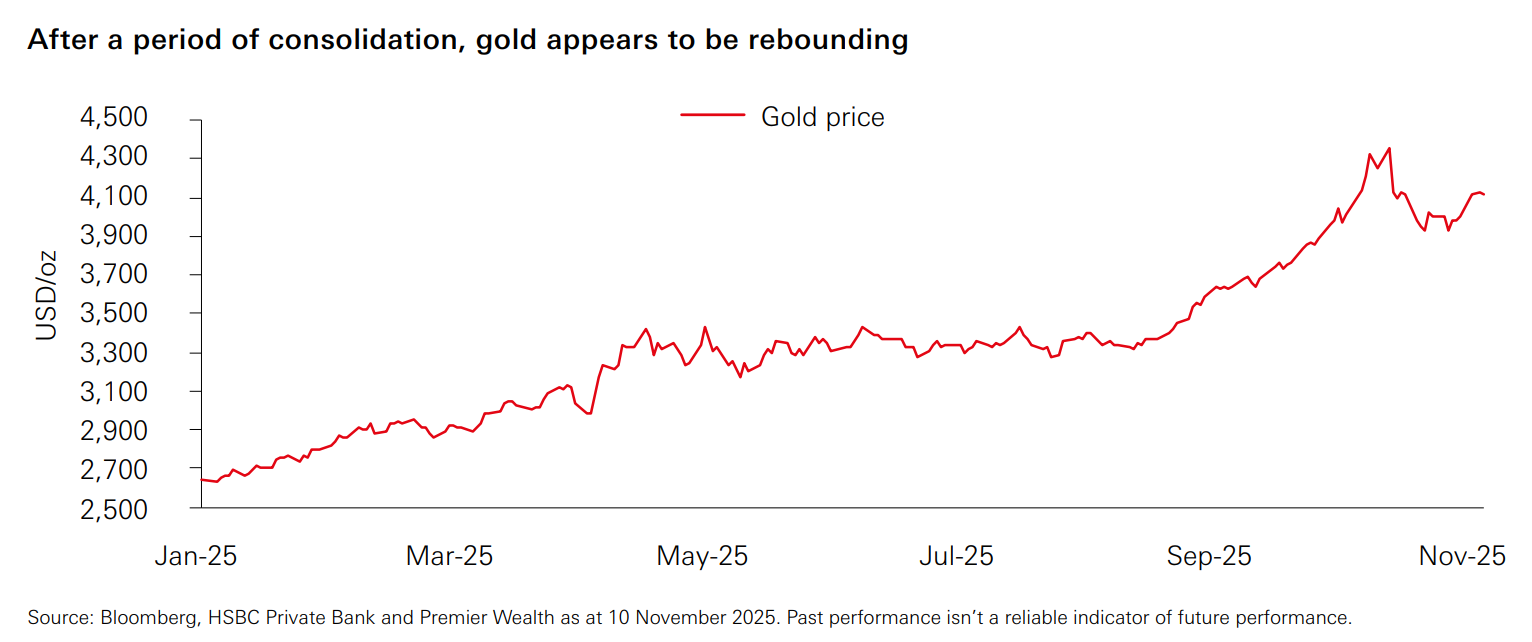 10月,金价一度触及 4,380 美元/盎司 的历史新高,随后因投资者获利了结短暂回落至 3,885 美元。然而,在约 4,000 美元附近的整固期结束后,金价近日已重新进入上升通道。Bohn 认为,美国政府停摆导致经济数据延迟发布,而这些数据可能强化市场对美联储在 12 月降息的预期,从而为黄金提供进一步动力。