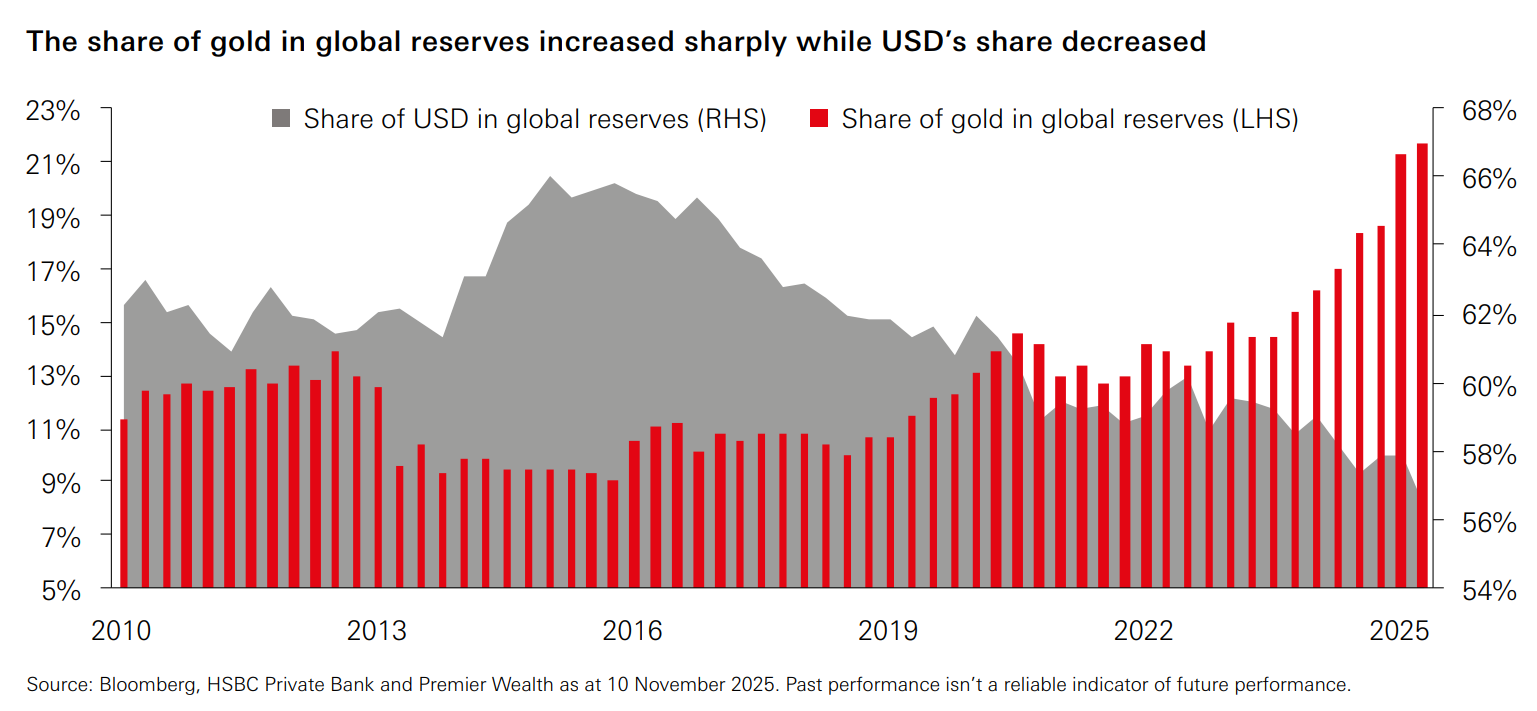 汇丰认为,央行持续增持黄金是金价强势的关键长期支柱。数据显示,自 2022 年以来,黄金在全球央行外汇储备中的占比从约 13% 快速上升至 2025 年第二季度的 22%;同期金价也从约 2,000 美元/盎司上涨至超过 4,000 美元,累计涨幅达 125%。