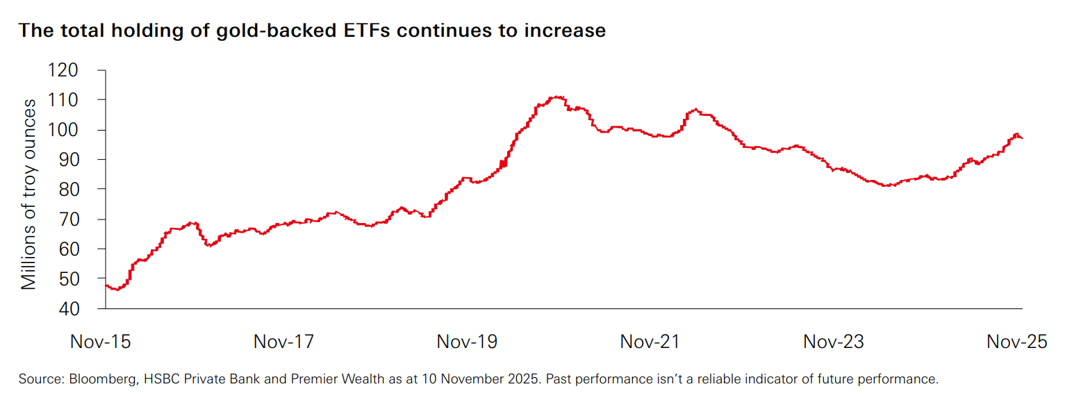 除了央行外,散户与机构投资者通过金ETF的配置需求也呈现明显回升趋势。自 2024 年年中以来,金ETF的资金流入持续改善,这反映出投资者在高不确定性环境下寻求资产分散与避险的需求不断增强。