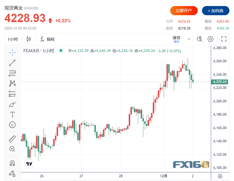 美市盘中,现货黄金上涨0.2%,日内稍早一度触及4263.95美元/盎司,为10月21日以来最高位。2月交割合约的COMEX黄金期货亦上涨0.2%,报 4262.70美元/盎司。