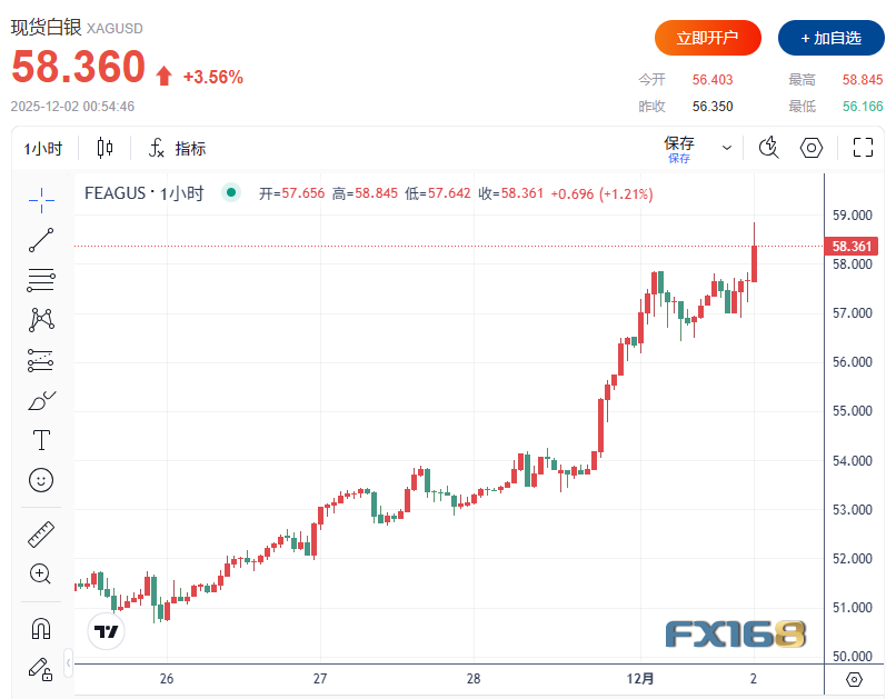 现货白银日内暴涨逾2美元或4%,盘中最高触及 58.845美元/盎司 的历史峰值。纽约期银站上59美元/盎司,日内涨3.21%。