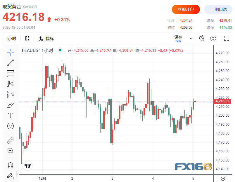 美市盘中,现货黄金上涨逾0.3%,并刷新日高至4219.41美元/盎司;COMEX 2月黄金期货升0.3%,至4243.70美元/盎司。