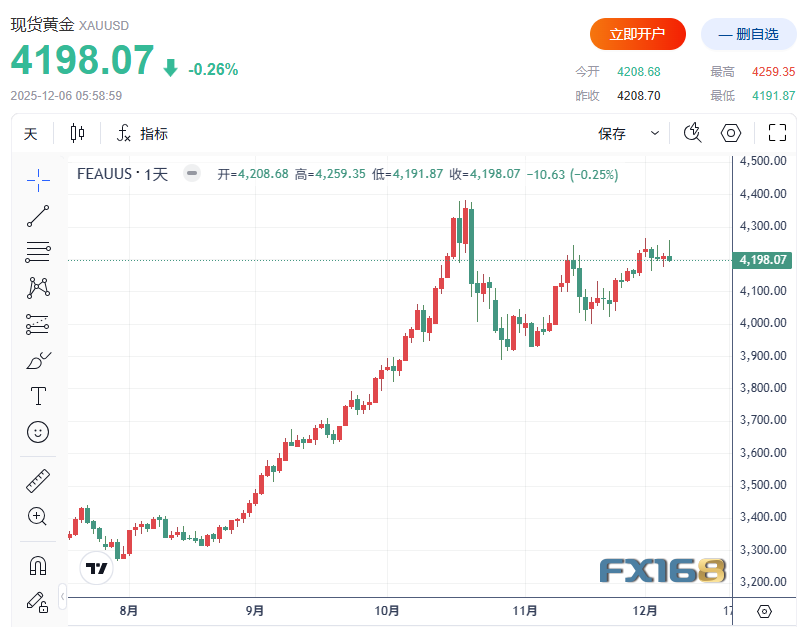 FX168财经报社(北美)讯 随着美联储将在下周公布年内最后一次利率决议,市场对货币政策前景的剧烈波动终于即将迎来定论。金价在过去六周的动荡中反复震荡,当前正试图在4200美元/盎司附近建立新的支撑区间。分析人士指出,如果美联储释放更为鸽派的信号,金价仍可能重新挑战历史高点,但若指引偏鹰,黄金或面临短线回调压力。