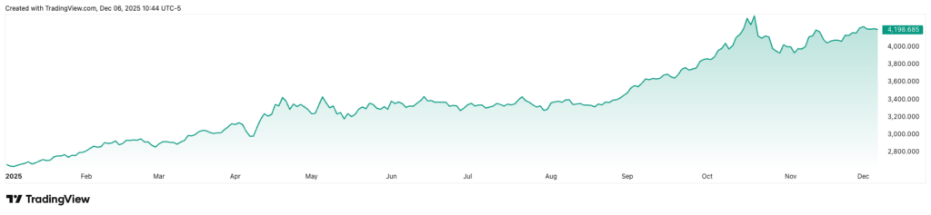 值得注意的是,黄金上一交易日(12月5日)收于4,198美元/盎司,日内下跌约0.24%。今年迄今,该金属累计上涨60%。