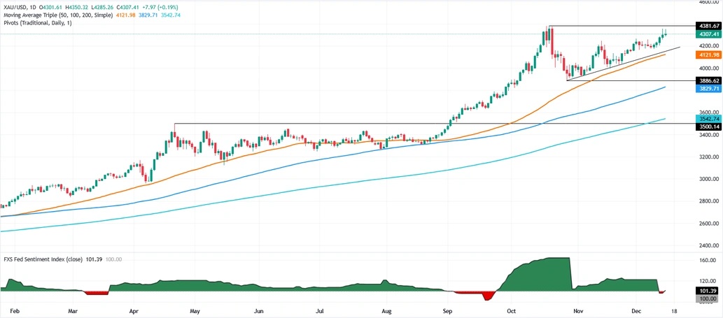 Valencia称,尽管金价徘徊在4300美元/盎司上方,但其整体趋势仍偏向上行,相对强弱指数(RSI)显示多头依然占据主导地位。RSI呈看涨态势,并已进入超买区域,表明买盘压力强劲。