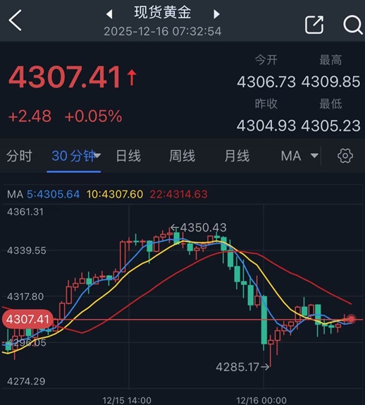 金价接下来自上述低点有所反弹,最终收盘报4304.93美元/盎司,日内仅微涨0.1%。