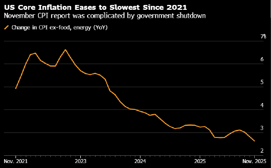 据美国劳工统计局(BLS)数据显示,11月份美国核心消费者物价指数(CPI)跌至2021年初以来的最低水平。总体CPI和核心CPI均出现下滑,但经济学家警告称,长达43天的政府停摆可能会扭曲劳工统计局工作人员为此次发布的数据。