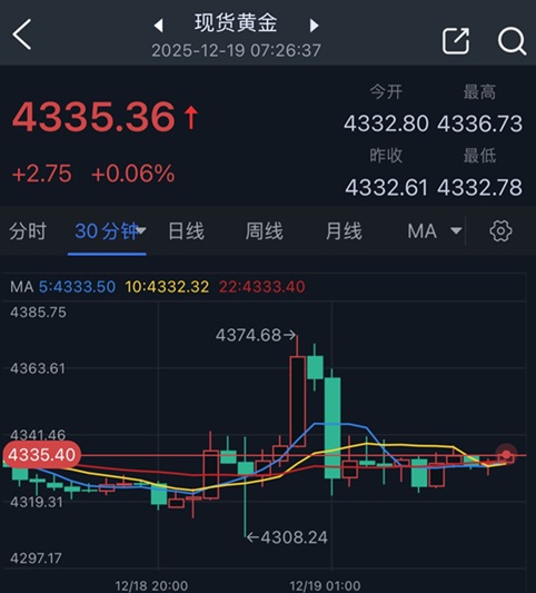 截至周四收盘,现货黄金收报4332.61美元/盎司,日内微跌0.13%。