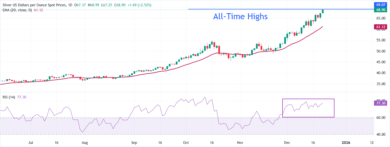 周一亚洲交易时段,银价(XAG/USD)上涨2.5%,接近69.00美元,创下历史新高。由于以色列和伊朗之间的紧张局势重新升温,投资者转向避险资产,白银价格走强。