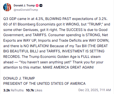 特朗普表示:“第三季度GDP达到4.3%,远超市场预期。这一成功源于良好的政府治理,以及关税政策。”