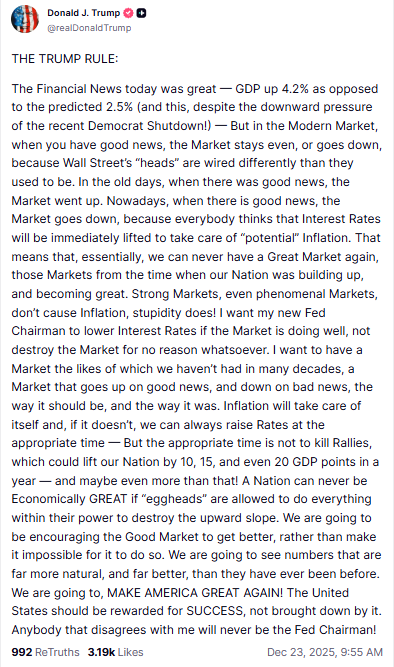特朗普在社交平台上发文称赞第三季度GDP数据的同时,还指责现在市场对强劲数据反应反常:过去好消息推高市场,如今好消息反而常导致股市持平或下跌——因为华尔街总担心好消息会立刻引发加息来预防“潜在”通胀。