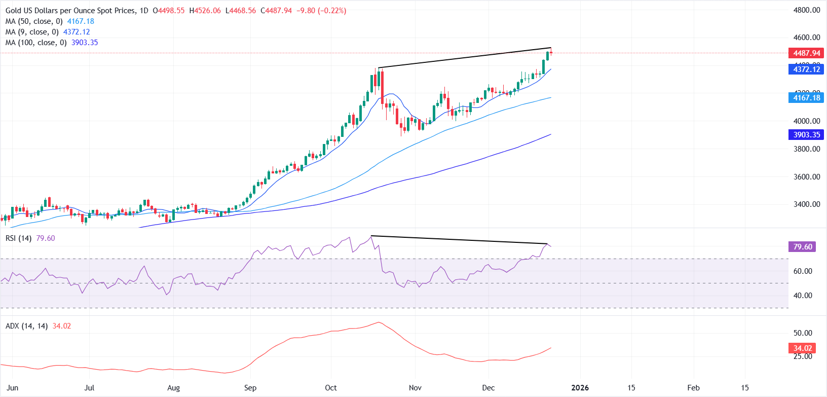 周三,黄金(黄金/美元)在水面上徘徊,价格在今天早些时候飙升至接近 4,526 美元的历史新高后进行盘整。由于圣诞节前假期流动性稀薄,亚洲时段波动性加大,促使在高位进行轻微获利了结。截至发稿时,黄金/美元交易在 4,487 美元左右,本周上涨超过 3.0%。