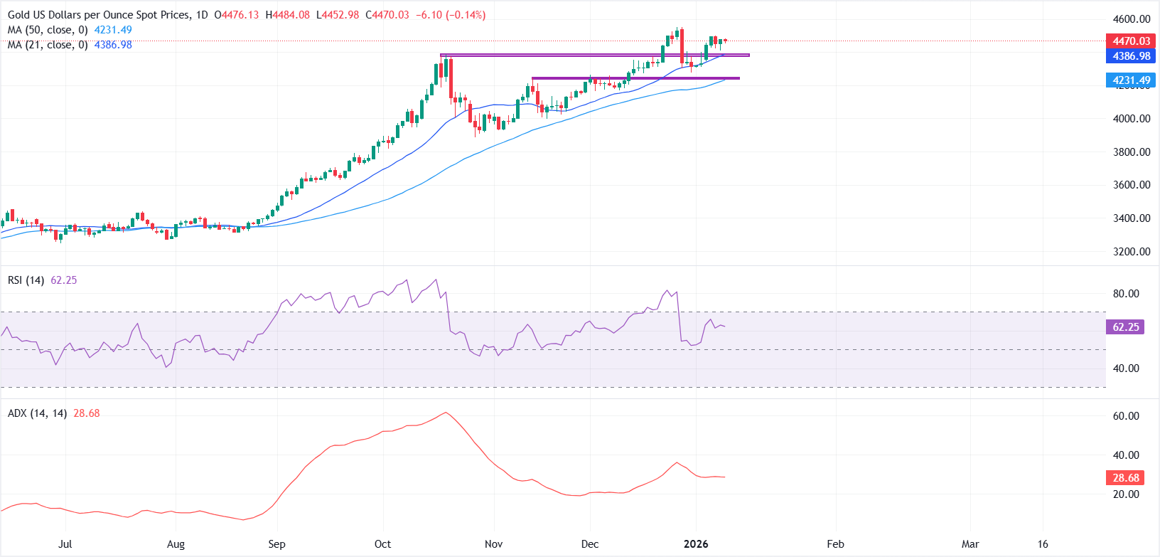 在下方,4400-4380标志着第一个关键支撑区。如果跌破该区域,将暴露在4231附近的50日SMA,打开更深回调的可能性。