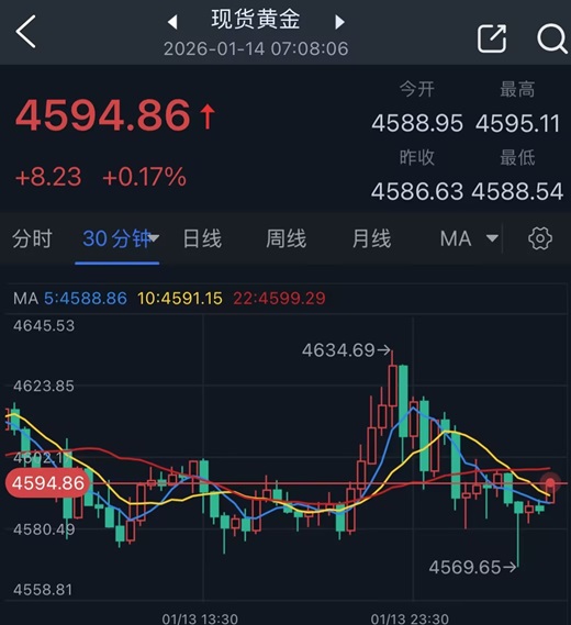 截至周二收盘,现货黄金报4586.63美元/盎司,当日收跌0.23%。
