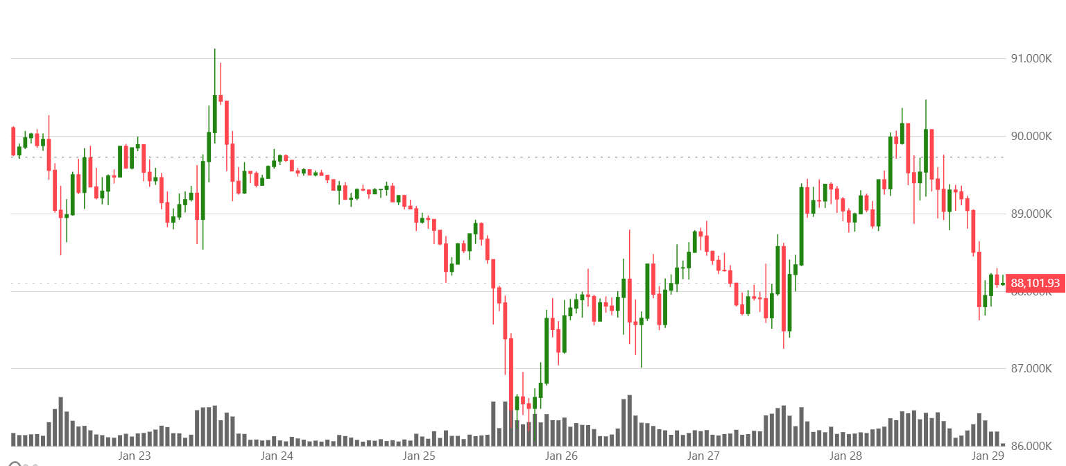 FX168财经报社(亚太)讯 在美联储决定维持利率稳定后,包括比特币在内的主要加密货币价格几乎没有变化,周四(1月29日)比特币加速下滑至8.8万美元附近,昨日冲击9万关口失败,与此同时,黄金再创历史新高。
