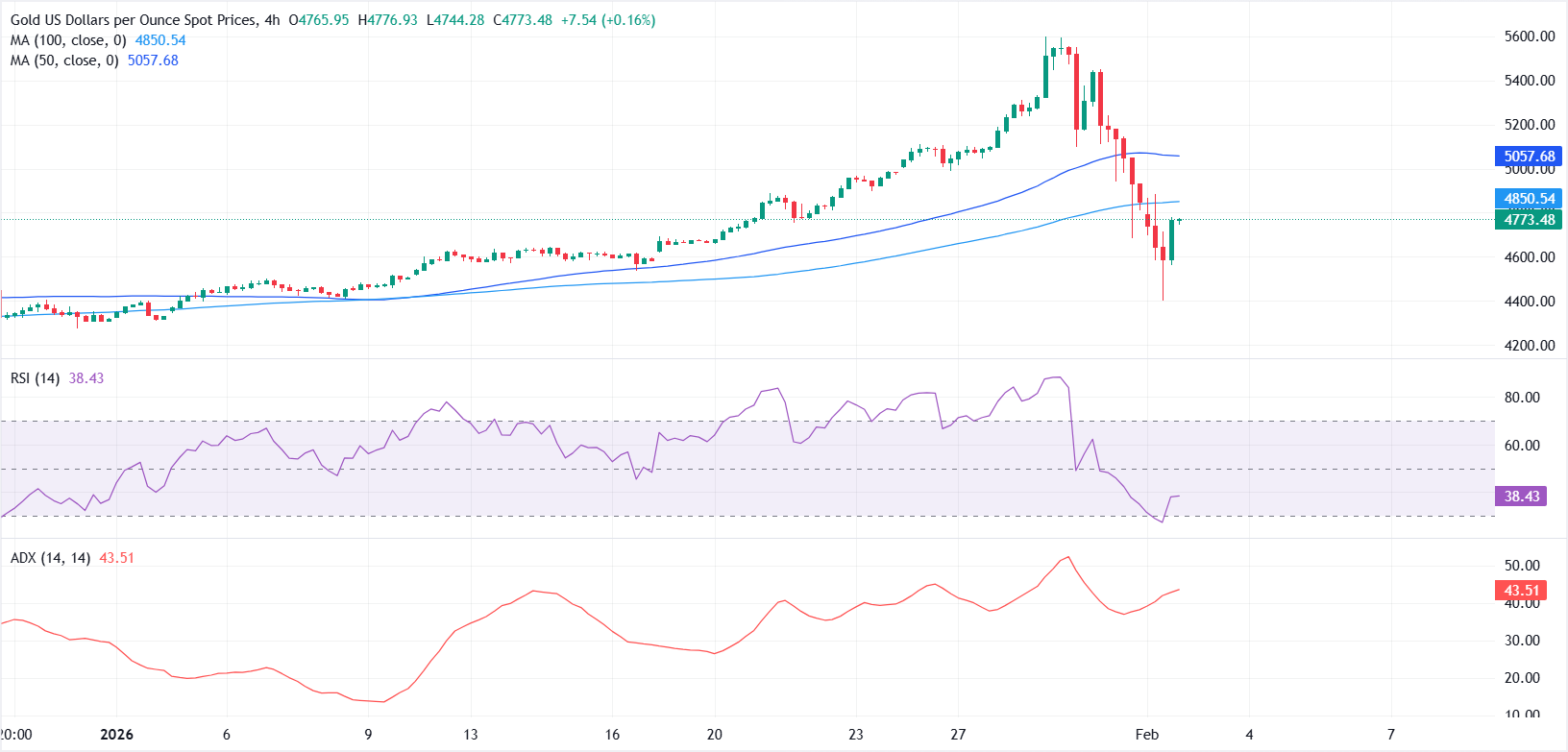 趋势强度随着平均方向指数(ADX)上升至43.51而增强,强化了持续的下行阶段。若能在4小时内收盘高于100期SMA,将有助于缓解即时下行压力,并可能为向50期SMA(在5057.28美元)反弹打开大门。