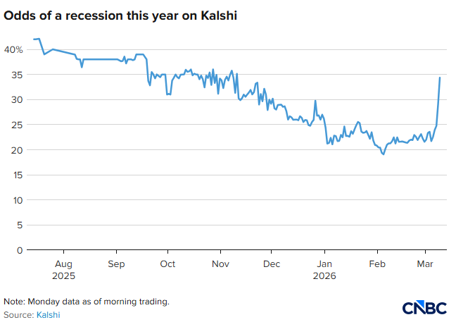 从宏观层面来看,油价飙升正在迅速推高市场对美国经济衰退的担忧。预测市场Kalshi数据显示,其关于“美国是否将在2026年陷入衰退”的合约概率周一升至34%以上,创去年11月以来最高水平,而在上周晚些时候,这一概率尚不足25%。Polymarket平台数据显示,市场押注美国在今年年底前陷入衰退的概率也已升至31%。