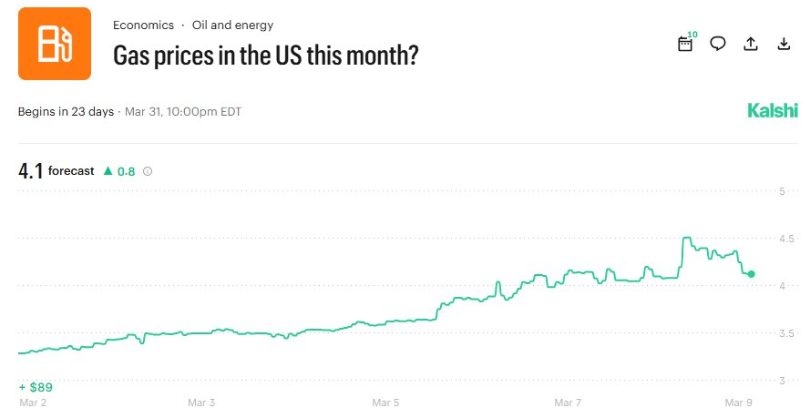 与此同时,交易者预计美国汽油价格继续上涨的可能性明显增加。Kalshi市场显示,美国全国平均汽油价格本月突破每加仑4美元的概率已接近60%。根据美国汽车协会(AAA)公布的数据,周一美国普通汽油全国平均价格为3.48美元/加仑,显示终端能源成本仍有进一步走高空间。