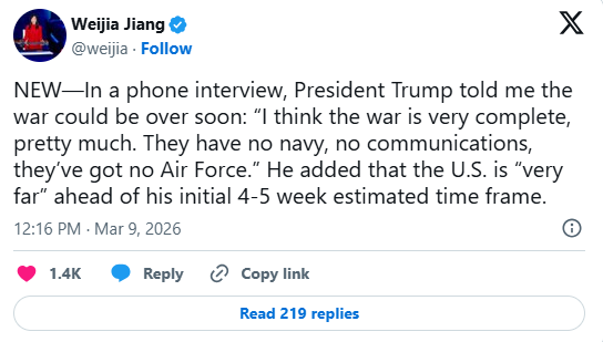 特朗普在接受 CBS 新闻电话采访时表示,目前仍有船只通过该海峡,并称他正在“考虑接管它”。他同时暗示,他认为战争很快就会结束。