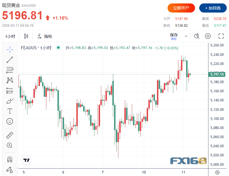 美伊冲突升级下,美元比黄金更受青睐,成为首选的避险资产。黄金价格持续震荡,受阻于5200美元/盎司之下。
