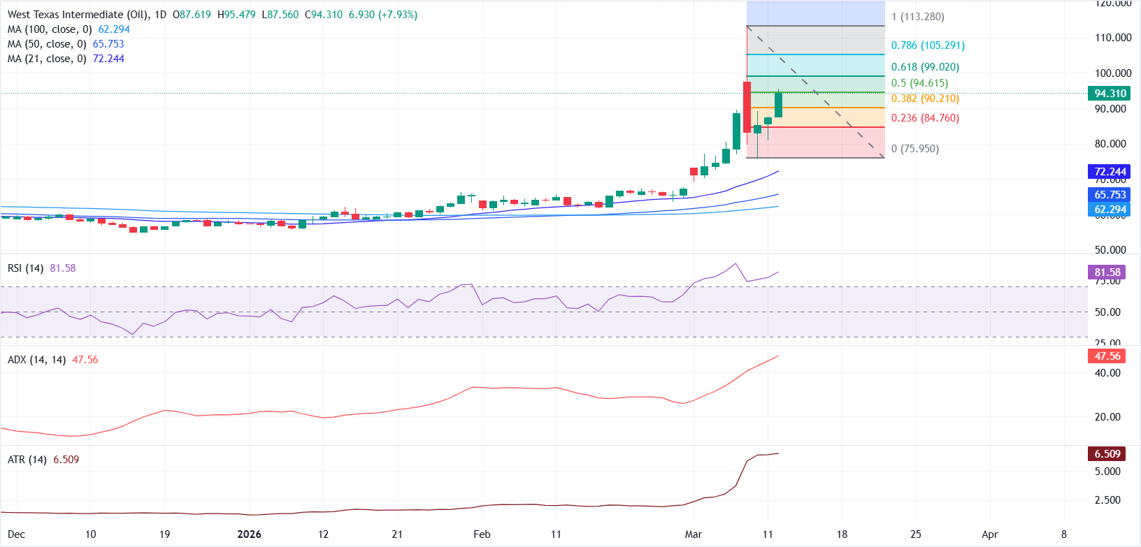 从技术角度看,日线图显示WTI在21日、50日和100日简单移动均线(SMA)上方加速上涨,显示出强劲的看涨动能。