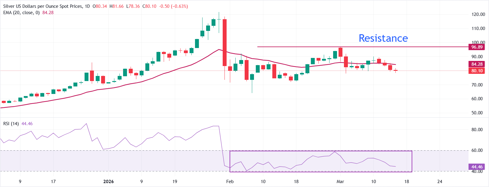 XAG/USD在当前时刻交易于约80.00美元。短期偏向看跌,因为现货价格保持在接近84.30美元的20日指数移动平均线(EMA)下方,确认了近期整合区间的下行突破。价格一直在形成更低的高点,同时反复未能重新夺回聚集的移动平均区域,这现在跟踪短期下行趋势。