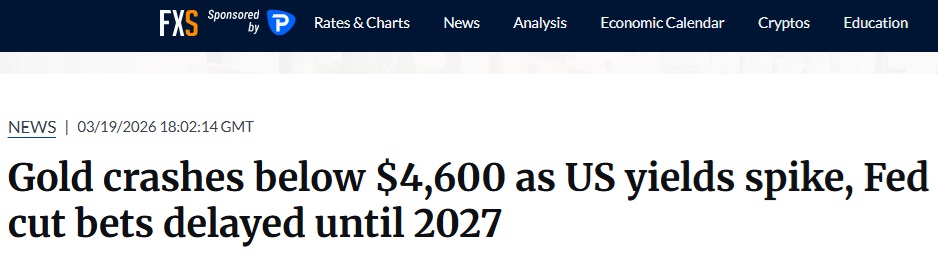 24K99讯 周四(3月19日),现货黄金价格暴跌,为连续第七个交易日收盘下挫。FXStreet分析师Christian Borjon Valencia撰文分析称,因美国国债收益率飙升、美联储降息押注推迟至2027年,金价周四一度跌破4600美元/盎司。