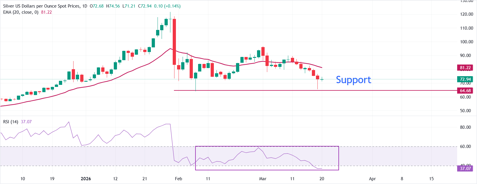截至发稿时,XAG/USD在72.80美元附近持平。短期偏向看跌,因价格延续跌破20日指数移动均线(EMA),该均线现位于现货价格之上,并在81.22美元附近形成动态阻力。从90美元中段跌至70美元低点的连续收低,凸显持续的卖压,而相对强弱指数(RSI)11个月来首次跌破40.00,确认下行动能,但尚未达到超卖区间。该形态保持卖方控制,除非价格能回升并稳定回到跌破的均线之上。