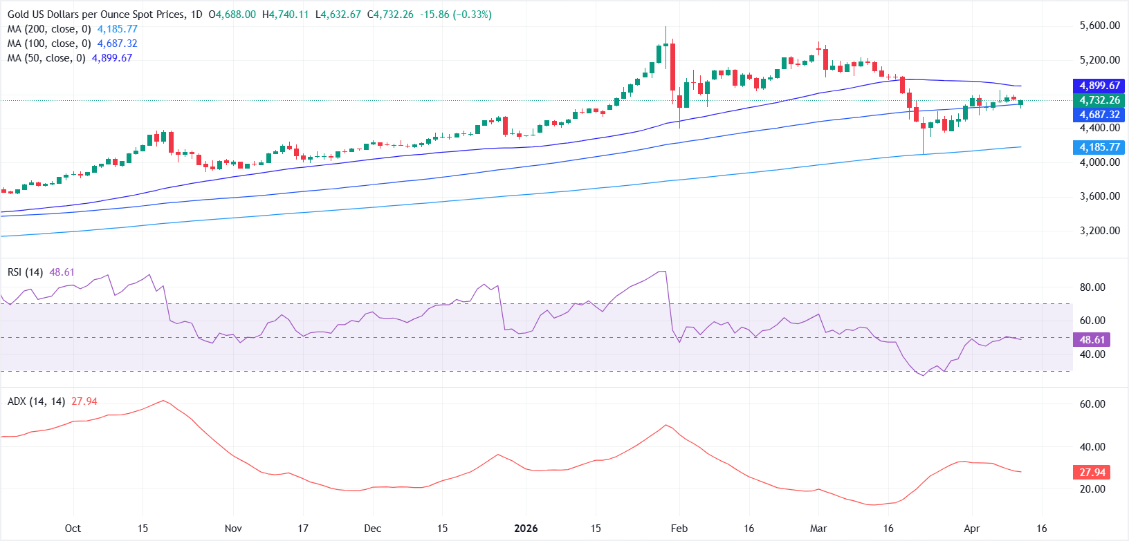 从技术角度看,日线图显示黄金/美元持稳于100日简单移动均线(SMA)4687.11美元上方,且远高于200日SMA约4185.66美元,但受制于50日SMA 4899.26美元下方。这使得整体偏向中性,略带下行倾向,价格在这些关键水平间盘整。