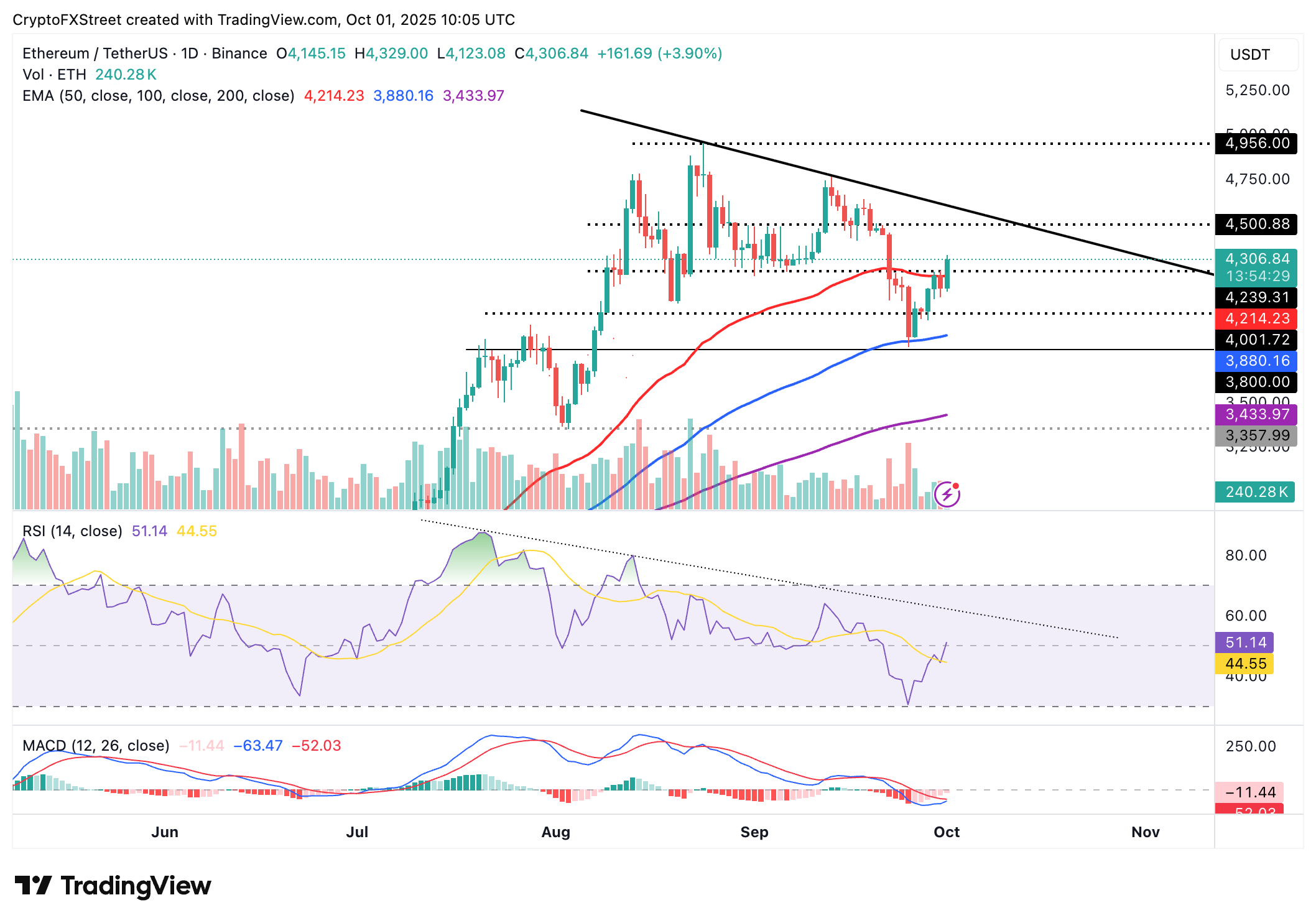 以太坊交易价格约为4,300美元,随着多头推动更广泛加密货币市场的价格上涨。其短期看涨前景得到了50日EMA在4,214美元,100日EMA在3,880美元和200日EMA在3,433美元的支持。RSI在信号线之上看涨交叉,表明看涨动能正在增强。