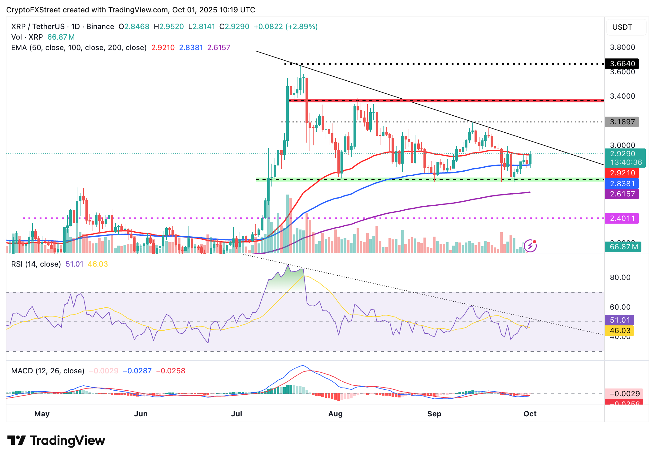交易者关注的关键区域是自7月中旬以来的下降趋势线,当时XRP达到3.66美元的新纪录高点,以及在9月13日作为阻力测试的下一个供应区3.18美元。